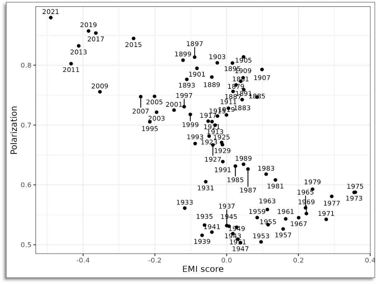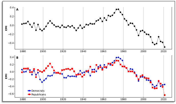 The figure below shows the temporal trend in EMI score, both overall (top) and broken down by party (bottom).