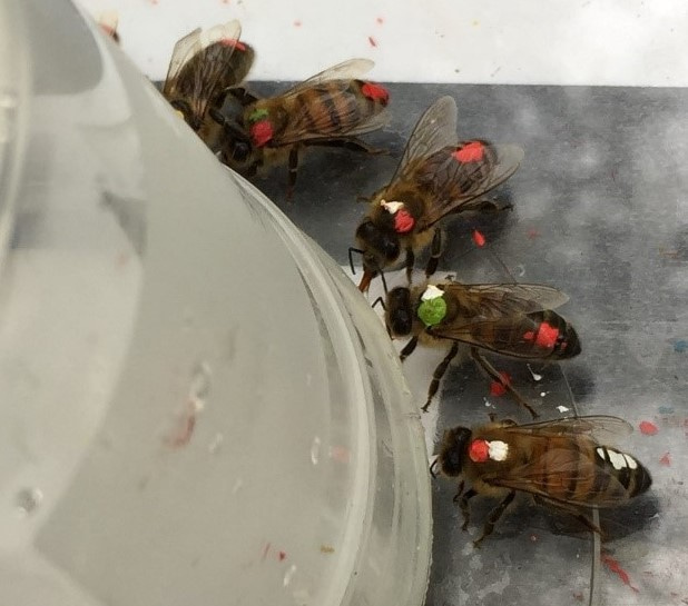 First, we needed to control the foraging opportunities available to our bees and the personal information each was privy to. To do this, we worked during late summer when natural food sources were scarce and provided bees with our own food sources instead. Working with one colony at a time, we trained two groups of bees to a pair of scented feeding stations (Figure 3). Importantly, each group only knew the location of one of these stations. Then, by emptying one of the feeders, we created an unemployed workforce that was now motivated to find the other, novel-to-them feeding location that was being advertised in the hive. Simultaneously, we recorded all in-hive interactions between our unemployed and employed cohorts (made possible by specially constructed glass-walled observation hives). We found that the order in which the unemployed foragers discovered the alternative feeding site was predicted solely by patterns of dance-following, indicating that communication of location information played a key role in this context. Olfactory information gained through trophallaxis or antennation alone was not sufficient to lead foragers to this new location.
