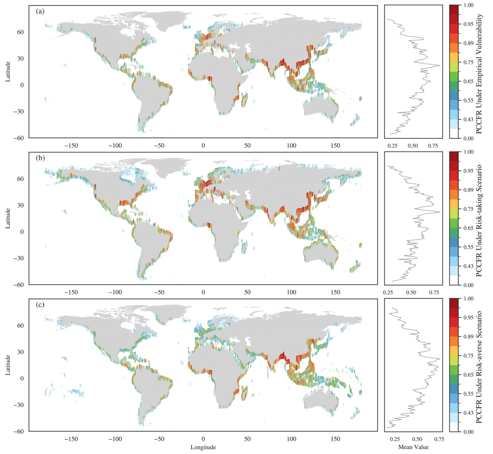 For these reasons, we quantify potential coastal compound flood risk at 0.1° resolution by integrating compounding flood hazard, population exposure, and empirical vulnerability that is not assuming risk aversion or seeking behavior. We introduce a compound flood metric, which aggregates riverine and oceanic flood volumes across multiple return periods and habitats (Figures 1 and 2). We further infer an empirical socio-economic vulnerability function based on the ratio between observed and maximum potential flood hazards, supporting Gross Ecosystem Productivity investments. Our results show that Asia presents the highest risk (35.22%), followed by Africa (20.21%), Europe (17.02%), South America (9.89%), and North America (2.31%), with river deltas and low-lying coasts emerging as global risk hotspots (Figure 1).