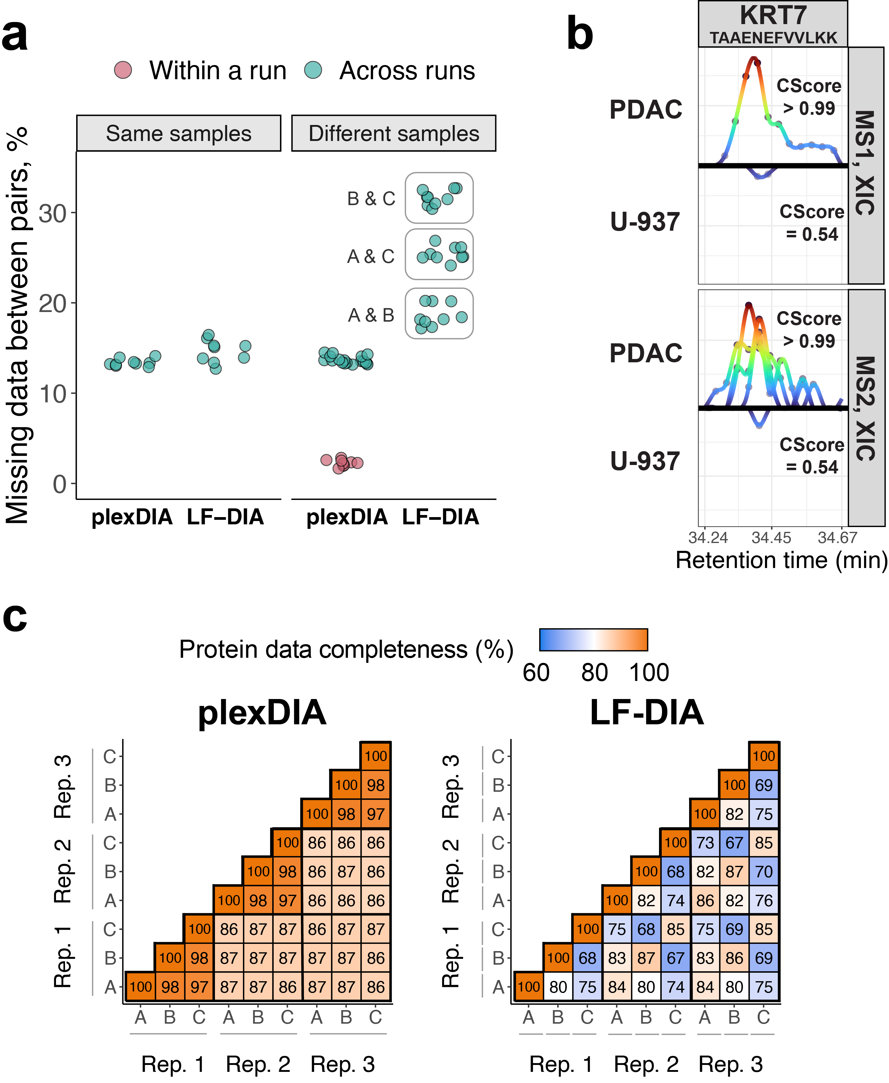 Samples run in parallel will have peptides that co-elute; because the mass offset of each sample’s peptides is known, confident peptide sequence identifications from one sample can be extended to other co-eluting samples, and in doing so, improve data completeness relative to LF-DIA. Multiplexed methods generally have this benefit, and we suspected the same may be true for plexDIA. However, given that LF-DIA is well known for achieving high data completeness, it was unclear how much plexDIA could improve upon it. Consistent with its renown, the LF-DIA data completeness between replicates of the same samples was high; yet, data completeness was surprisingly low between pairs of samples that had dissimilar protein compositions. In other words, the more different a pair of samples’ proteomes were, the more missing data between the pair of samples for LF-DIA. This is problematic if one wishes to quantify differentially abundant proteins… plexDIA, however, maintained low data missingness across dissimilar samples, achieving as low as 2% missingness within a set (i.e. run) as shown in Fig 2a.