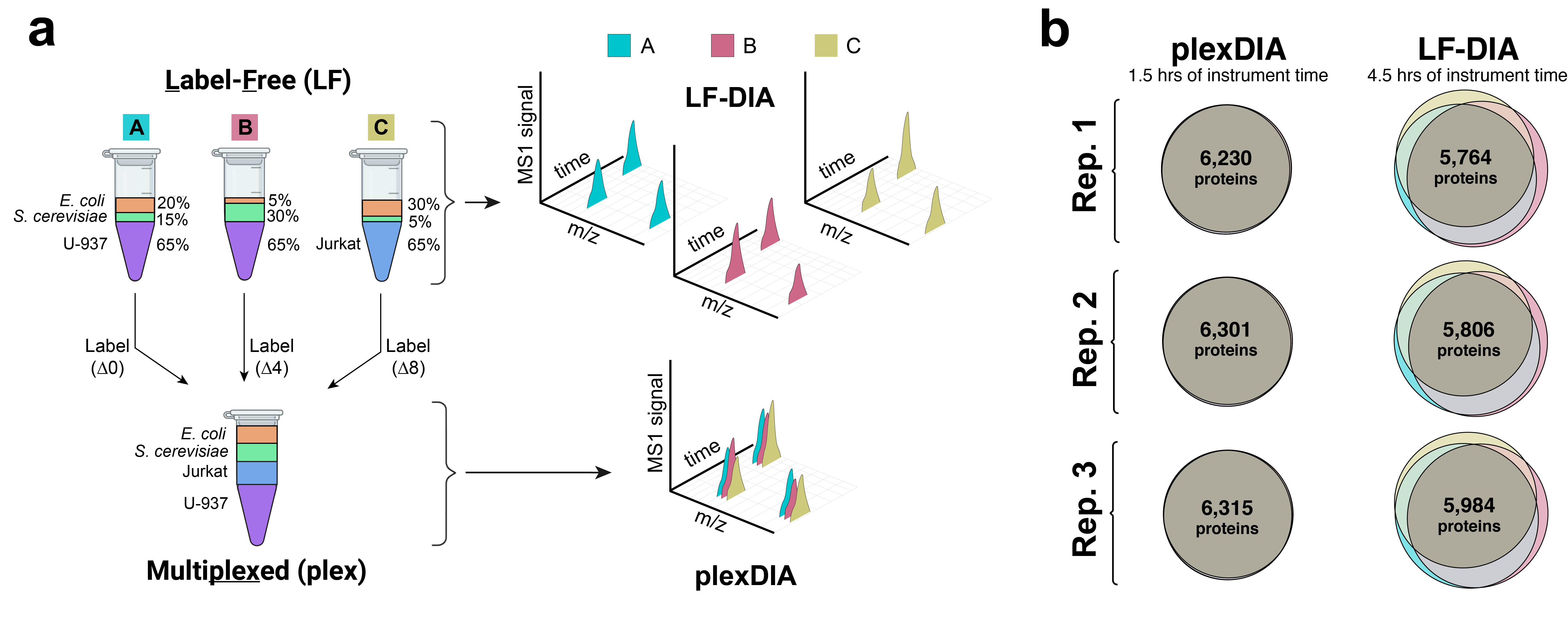 Our goal with plexDIA was to develop an experimental and computational framework that would maintain the advantages of label free (LF) DIA while scaling the throughput multiplicatively. We collaborated with Vadim Demichev, the author of DIA-NN—a widely used DIA data analysis software—and began exploring this possibility with some standards composed of bacteria, yeast, and human proteomes spiked-in at different ratios to benchmark the quantitative accuracy and proteomic coverage of plexDIA and LF-DIA as shown in Fig. 1a. After months of experimental and analytical fine-tuning, plexDIA only achieved about 84% of the proteomic depth as LF-DIA—it was nearly multiplicative scaling, but not quite; naturally, I was disappointed.