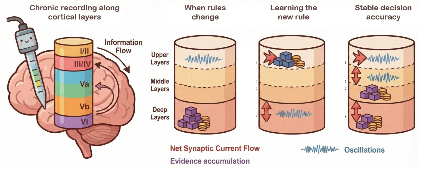 Continuous recordings across layers reveal how the brain moves from error-driven updating to stable decisions. Neural activity across cortical layers changes when rules are updated. After a rule change, errors dominate processing in deep cortical layers. During relearning, the information flow is actively reorganized. Once performance stabilizes, upper layers support accurate and reliable decision-making.
