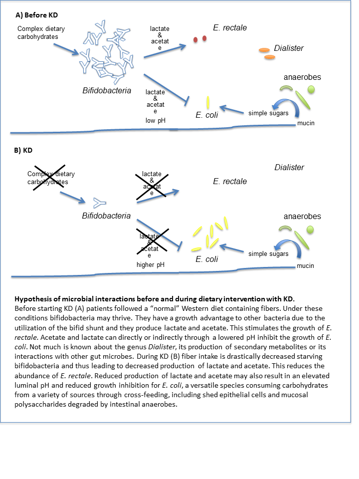 My son’s neurologist Maria was actively involved in research on effects of the ketogenic diet on children with severe epilepsy. We agreed that it would be important to study the changes in the gut microbiome during this treatment and started recruiting patients in 2014. However, there are few patients at Karolinska Hospital that start this diet and more than half of them had to be excluded due to antibiotic treatment before collecting the first or second sample. Thus, it took rather long time to get the pilot cohort of 12 patients described in our article. Here, we used whole metagenomic sequencing to describe how the gut microbiota composition and function changes in children with severe epilepsy during treatment with the ketogenic diet. Relative abundance of Eubacterium rectale, Dialister and several species of Bifidobacterium, including B. longum and B. adolescentis decrease within three months and several functions including metabolism of carbohydrates are reduced concomitantly. We detected significant enrichment of Escherichia coli and the hemin transport system. Increased abundance of E. coli has been associated with inflammatory bowel disease and colorectal cancer and iron acquisition has recently been shown to be critical for bacterial pathogenicity. We thus raise concern about potential undesirable effects of the ketogenic diet on the gut microbiota and gut health. However, we do not know at this point whether the changes we detected are necessary for the anti-epileptic effect of the diet. We keep recruiting patients and aim at a follow-up study in order to compare microbiota changes in responders and non-responders in a multi-omics approach. Elucidating the role of the gut microbiota in the anti-seizure effect of the ketogenic diet might enable us to manipulate this microbial community to improve treatment of epilepsy.