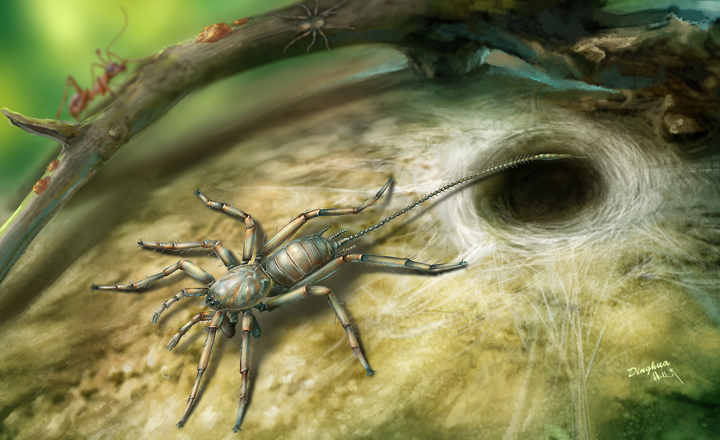 Figure 3. Reconstruction of Chimerarachne yingi and its web. The silk can be used for egg wrapping or for lining tunnels. Modern mesotheles all build tunnels although the new fossils don’t really let us answer this question.