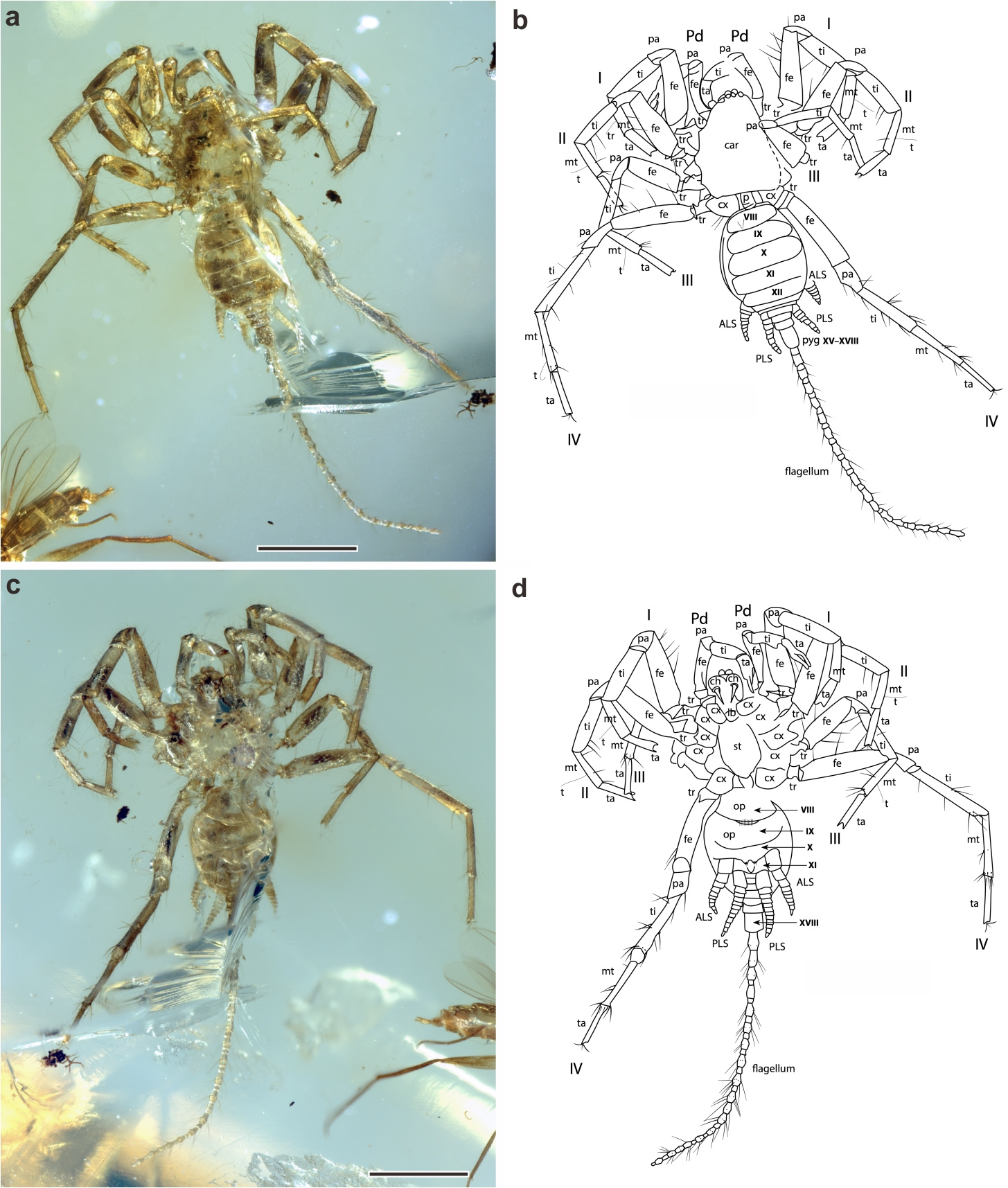 Spiders are one of nature’s success stories with more than 47,000 living species. A recent discovery from the ca. 100 million year old Burmese amber of Myanmar sheds important light on where spiders may have evolved from. Chimerarachne yingi is an extraordinary fossil species described in the journal Nature Ecology and Evolution by an international research team from China, Germany, the USA and the UK. Chimerarachne looks like a spider and preserves several important spider features such as spinnerets for laying down strands of silk and a modified male pedipalp which was used to transfer sperm during mating. Uniquely, it also has a long whip-like tail. It is either the most primitive spider known, or else belongs to a group of extinct arachnids which were very close to spider origins. Either way, the implication is that there used to be a time when spiders still had tails.