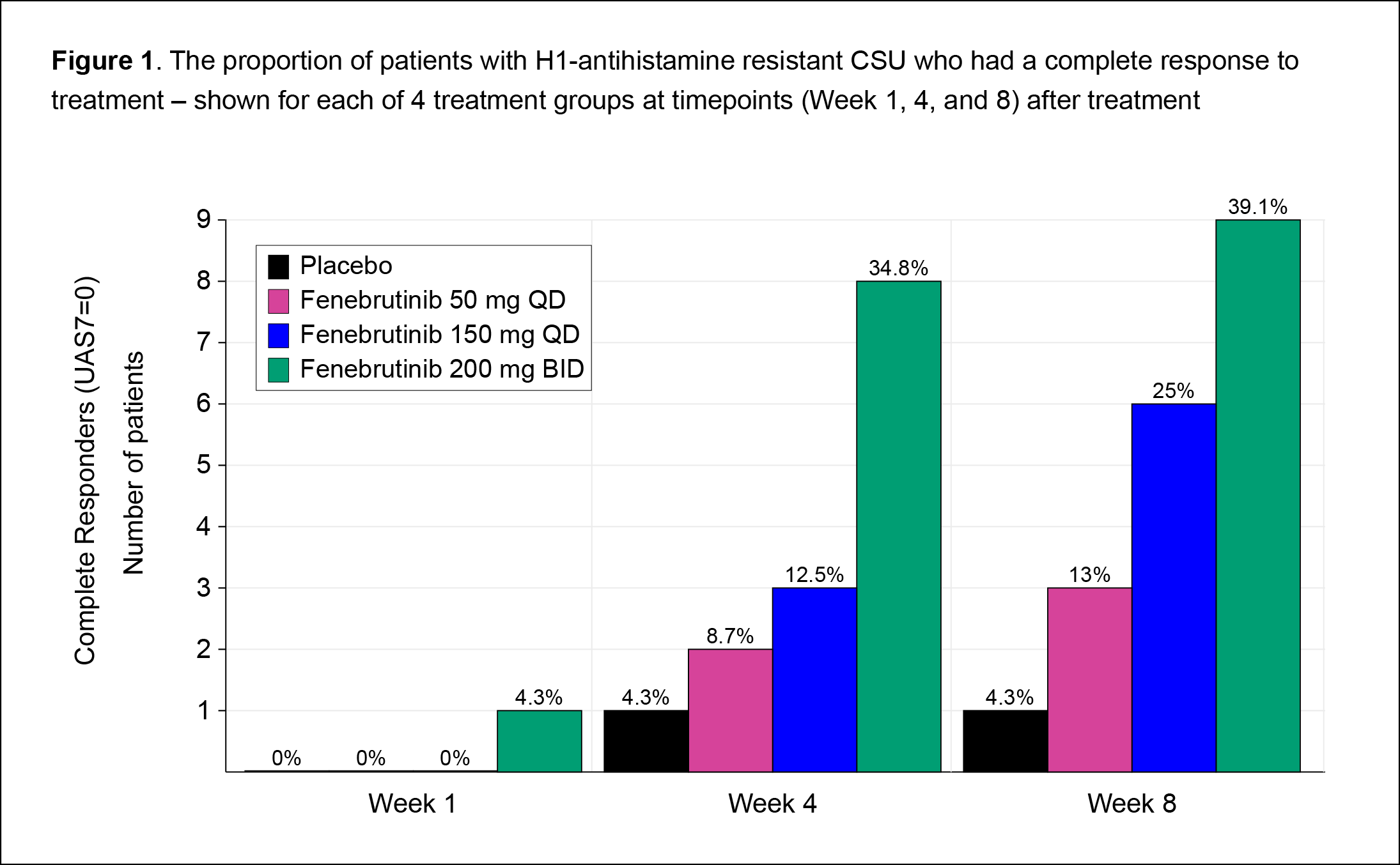 The focus of the study (primary endpoint) was a measure of the change in disease score at Week 8 in comparison to baseline – using the Urticaria Activity Score over 7 days (UAS7). The study also measured (secondary endpoints) – the change in UAS7 at Week 4 versus baseline, the proportion of patients whose disease was well controlled (UAS7 ≤6) at Week 8, efficacy in patients with type IIb autoimmunity, and effects on IgG-anti-FcεRI levels.