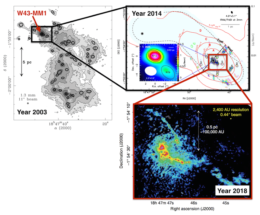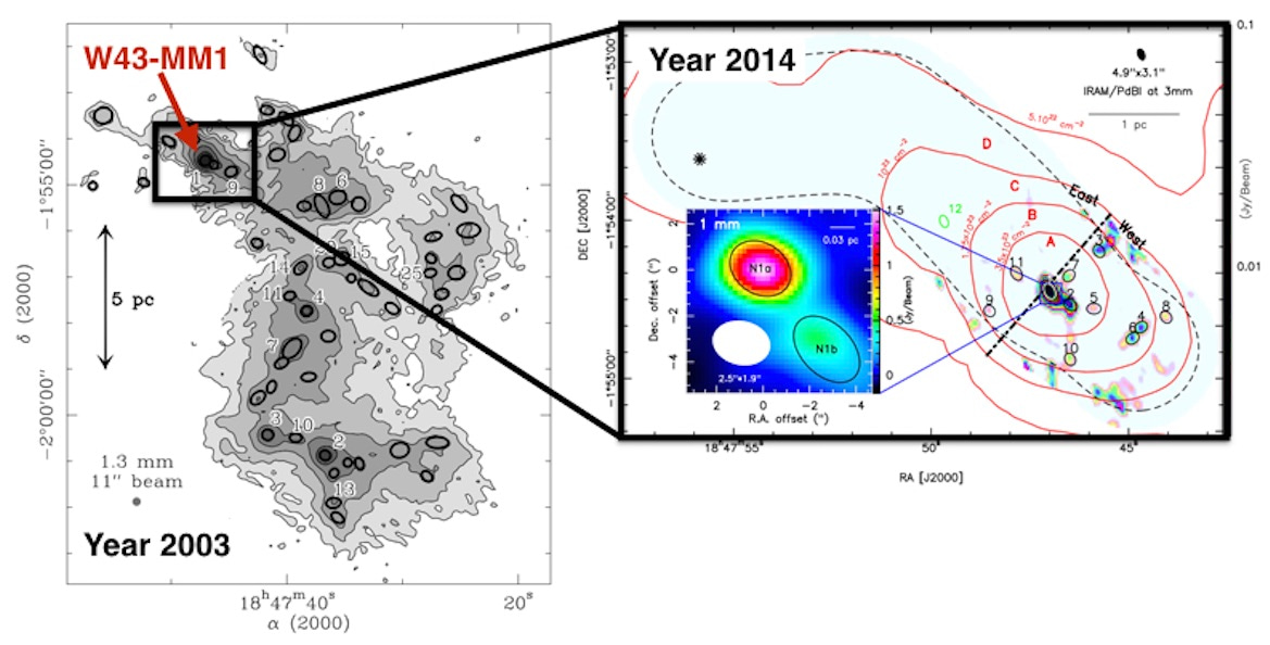 Then in 2014, we mapped this promising source with the Plateau de Bure, a millimeter interferometer located in the French Alps. We found that the gas was assembled in very massive and dense structures, like W43-N1, a core that has about 2100 times the mass of the Sun in gas, packed in about 15 times the area of the solar system.