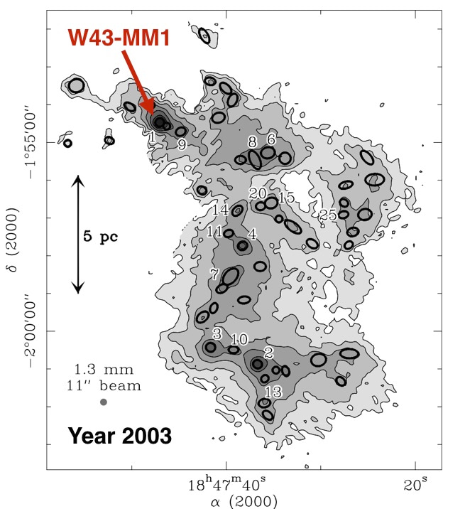 This discovery is also the story of the increase in angular resolution over time, i.e. our ability to see smaller and smaller structure. In 2003, F. Motte and her collaborators mapped the W43 complex with a camera called MAMBO installed in the radio-telescope IRAM/30m in the south of Spain. They found very dense clouds of gas, among which W43-MM1, which gathers enough gas to form about 4.000 Suns in an area of 40 times our Solar system.