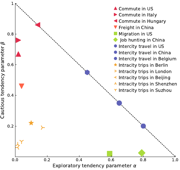 From this triangle, we can see that both commuters and truck drivers are generally more cautious when selecting destinations. On the other hand, both migrants and job seekers usually are more exploratory. Intercity travelers' destination selection behavioral tendencies are somewhere between those of the commuters and migrants. For intracity travelers, both exploratory and cautious tendencies are weak. These results may help us better understand the underlying mechanism of the individual's destination selection behavior in different types of human mobility.