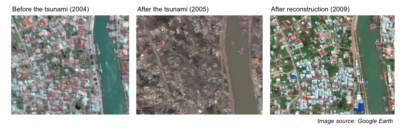 Banda Aceh and surroundings after reconstruction. The 2004 tsunami reached ~3 km inland across the low-lying terrain. Following this, the city was rebuilt mostly in-place near the coast.