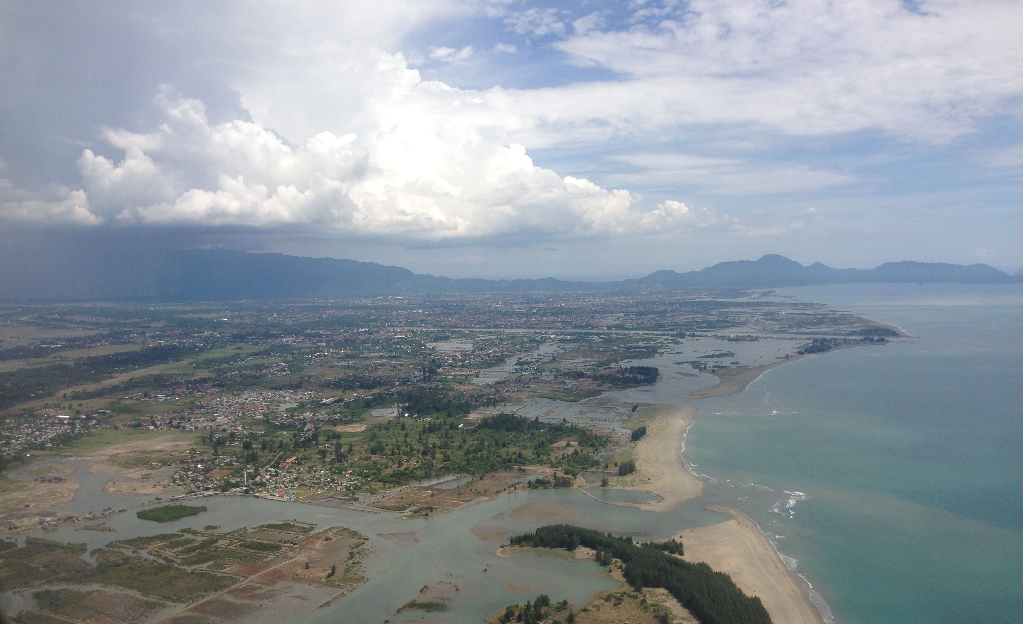 Banda Aceh and surroundings after reconstruction. The 2004 tsunami reached ~3 km inland across the low-lying terrain. Following this, the city was rebuilt mostly in-place near the coast.
