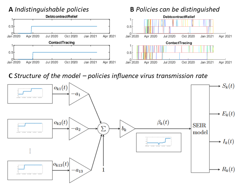 There is, however, one catch, painfully familiar to all scientists working with biomedical systems. For a model to be well parametrized, abundant data for fitting are needed. Meanwhile, nearly all available real-life datasets are scarce, noisy, and internally correlated. For example, as seen in Fig 1A, the timelines of two policies, debt contract relief and contact tracing, are the same for a single country. Effectively, they are indistinguishable in terms of modelling and the corresponding parameters are non-estimable as increase in one can be compensated with a decrease in the other. This problem can be countered by using data from multiple countries (Fig 1B) – the pandemic is a global crisis.