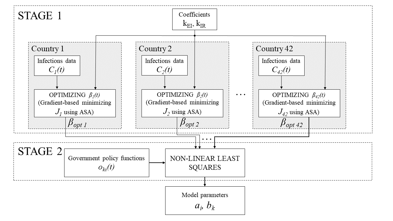 We estimated the parameters using a two-stage procedure depicted in Fig 2. In the first stage, a time-dependent function 𝛽opt(t) is estimated for each country using a gradient method based on adjoint sensitivity analysis [2]. In the second stage, data from all the countries are integrated and a function of restrictions is fitted to the 𝛽opt using a non-linear least squares method.