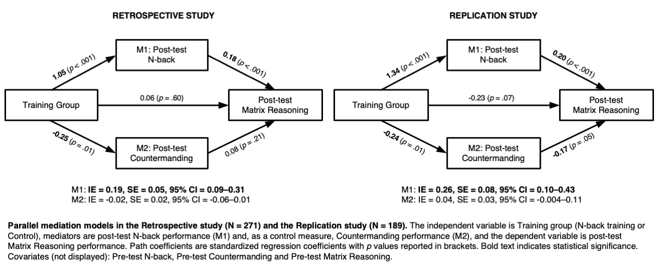 The results of the Replication study confirmed the original finding that near transfer mediates far transfer on a measure of abstract reasoning. Nonetheless, we observed inconsistent intervention effects on far transfer, meaning that even when these mediators were taken into account, no reliable improvement in abstract reasoning was observed in some cohorts. While this may seem counterintuitive, mediated effects can be statistically significant in the absence of such effects9. The results also showed that near transfer mediated transfer to a working memory composite, which showed a small but significant intervention effect.