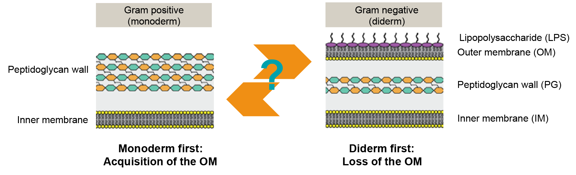 This is indeed the case of the Firmicutes. The Firmicutes are textbook examples of the Gram-positive cell envelope. They comprise notorious pathogens such as Streptococcus and Staphylococcus. However, they surprisingly also include two lineages, the Halanaerobiales and the Negativicutes that have an outer membrane (OM) with lipopolysaccharide (LPS). These two lineages are phylogenetically distinct and each closely related to different monoderm Firmicutes. A previous study of this phylum within our group allowed to put forward the hypothesis that the ancestor of all Firmicutes already had an OM, which was retained in Negativicutes and Halanaerobiales while it was lost multiple times independently during the diversification of this phylum to give rise to the classical Gram-positive cell envelope architecture. Therefore, the transition went from diderms to monoderms, at least in the Firmicutes, representing a striking example of evolution by simplification.