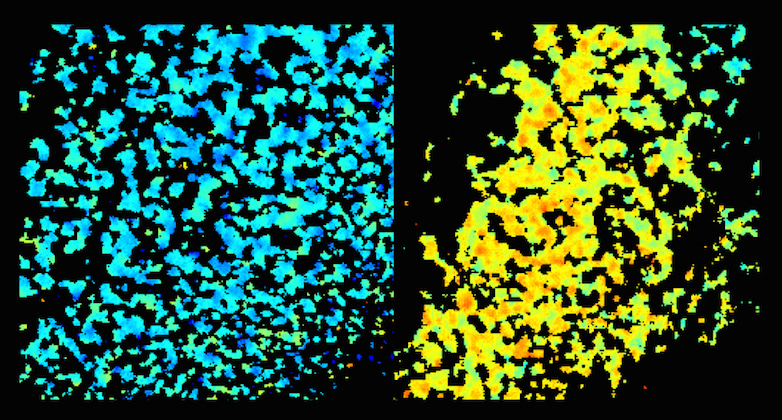 Image 1: Detection of fluorescence resonance energy transfer (FRET), measured by fluorescence lifetime imaging microscopy (FLIM) of HIV-1 virions, shows a specific interaction between A3G and HIV-1 reverse transcriptase (right panel) but not between A3G and HIV-1 Capsid protein (left panel). Yellow/orange indicates FRET and blue/green indicates absence of FRET.