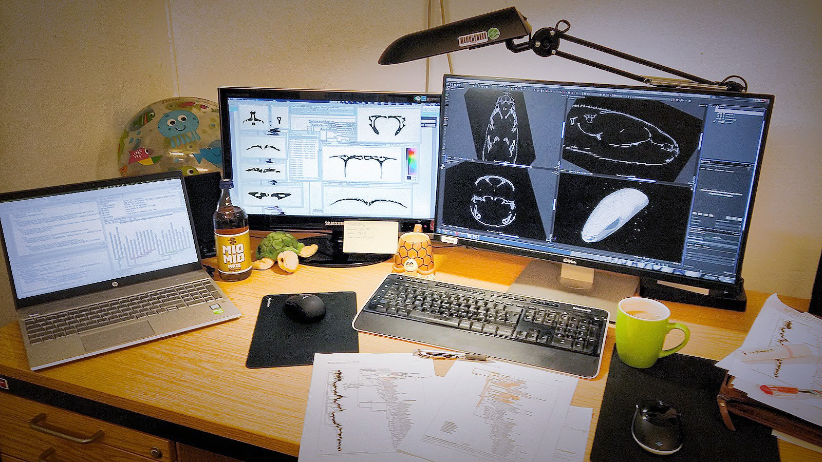 This desk at the CT-Vis-Lab of the Museum für Naturkunde Berlin says quite a bit about our working routine. From right to left: VG Studio MAX for processing 3D-volumes acquired with µCT, ImageJ for processing extracted slices, and R-Studio for the analysis of convergence and lifestyle signal. As a coincidence, the stages of data reduction correlate with decreasing screen size. ...and who would have thought that this is how a biologist's workspace may look like? Photo by Roy Ebel.