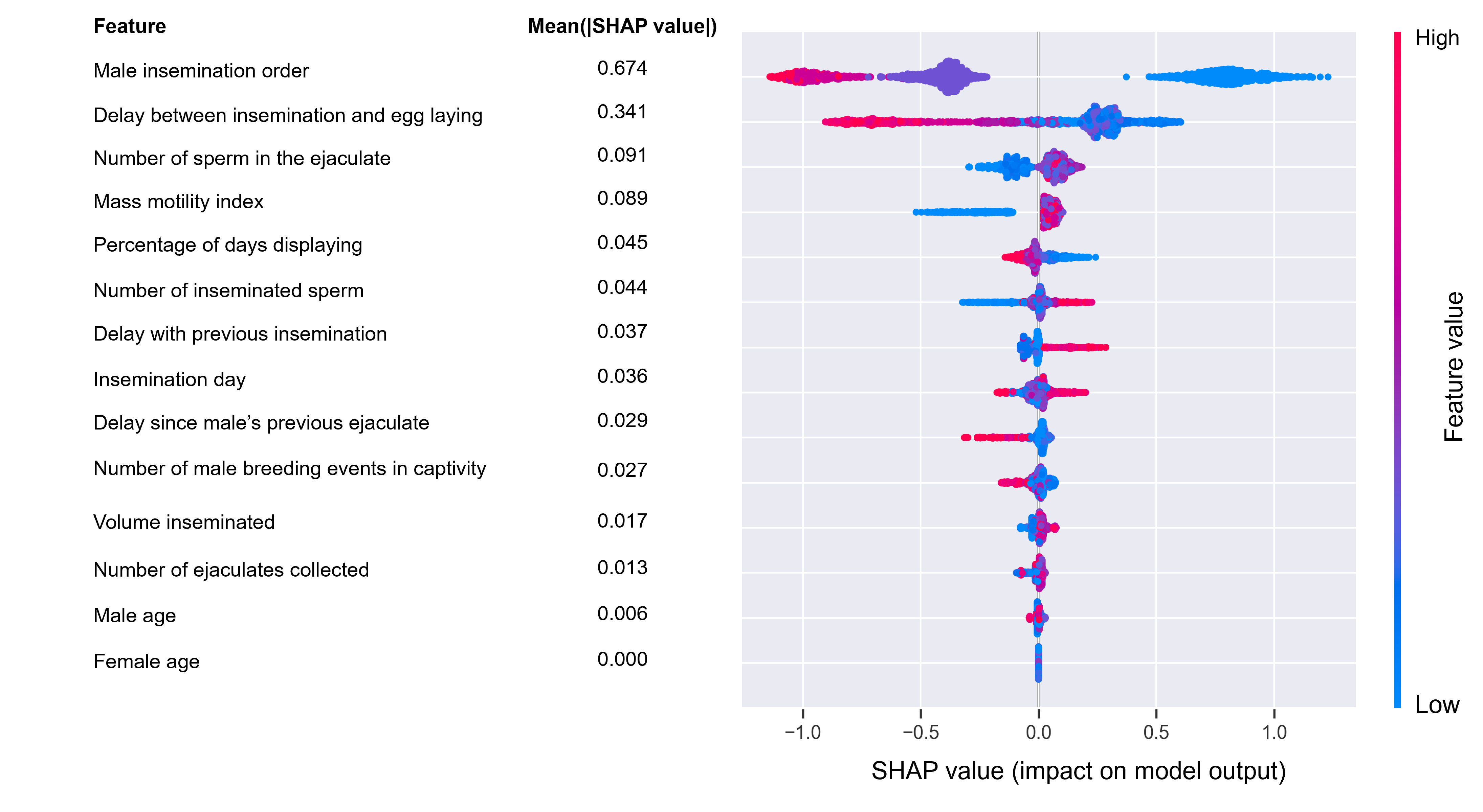 Figure 1. We used SHapley Additive exPlanations (SHAP) to interpret the output of the gradient boosted trees model. The variables on the vertical axis are ranked according to the mean of the absolute SHAP values, indicating their relative importance as predictors of siring success (higher mean absolute SHAP values corresponding to a larger contribution to the siring success prediction). Dots represent the SHAP values (positive values being indicative of higher siring success, lower values being indicative of higher siring failure) for each insemination (N = 2,226) as a function of the value of the predictor (the redder the color the higher the value of the predictor). Please note that the insemination order is inversed (1 referring to the last male in the sequence). Percentage of days displaying was used as a proxy of investment into secondary sexual traits, and number of male breeding events in captivity as a proxy of adaptation to captivity.