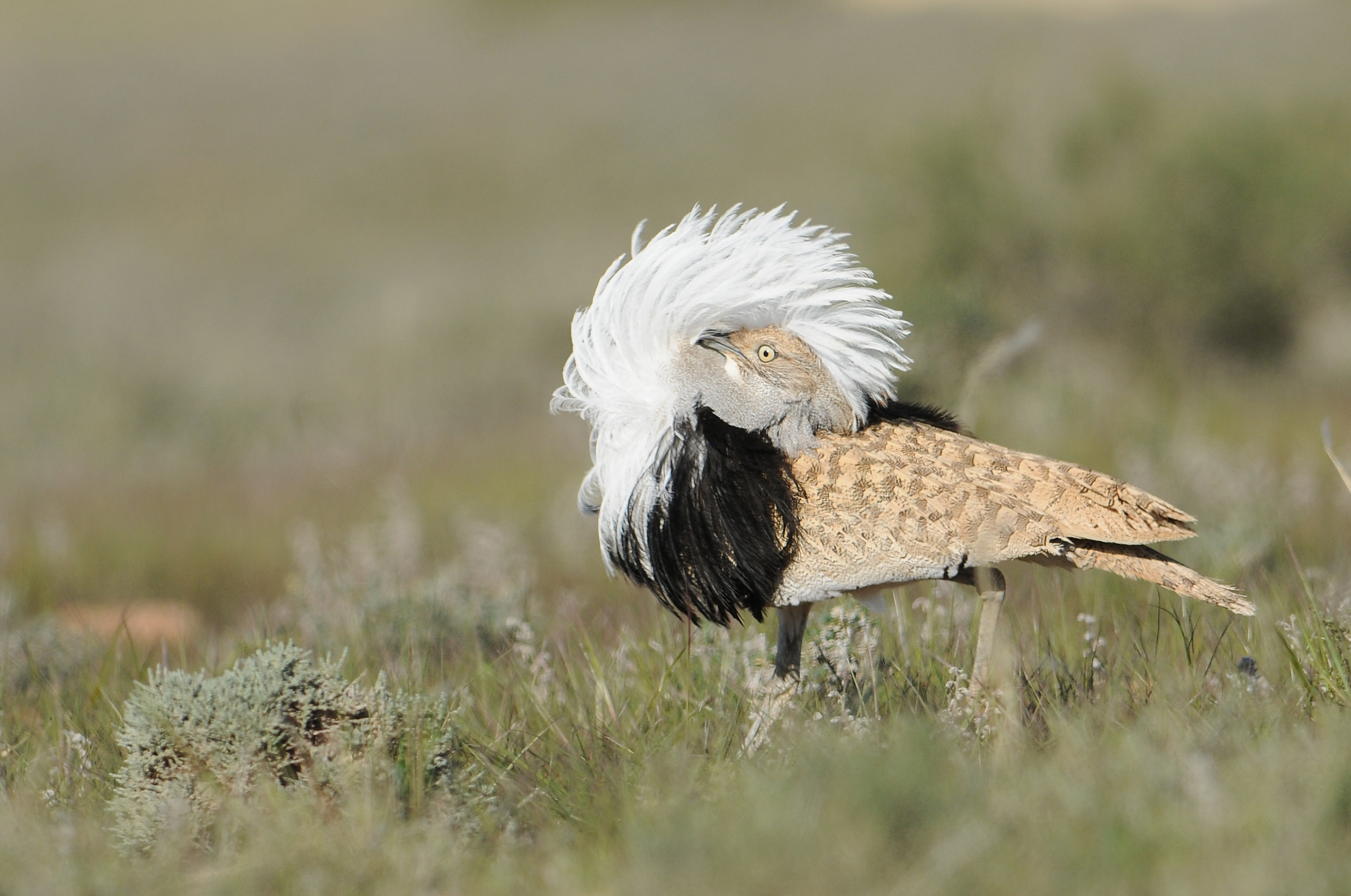 A male North African houbara bustard performing a sexual display (Photo credit: Yves Hingrat). During the display, the male erects the white feathers of the neck and the chest and performs a circular running. The display is also accompanied by a booming.