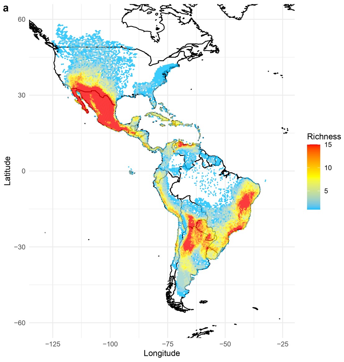 Figure 2: The spatial distribution of species richness in cacti across the Americas. Cacti are widely distributed throughout ecosystems in the Americans, and there are several notable hotspots with elevated diversity in arid and semi-arid regions.