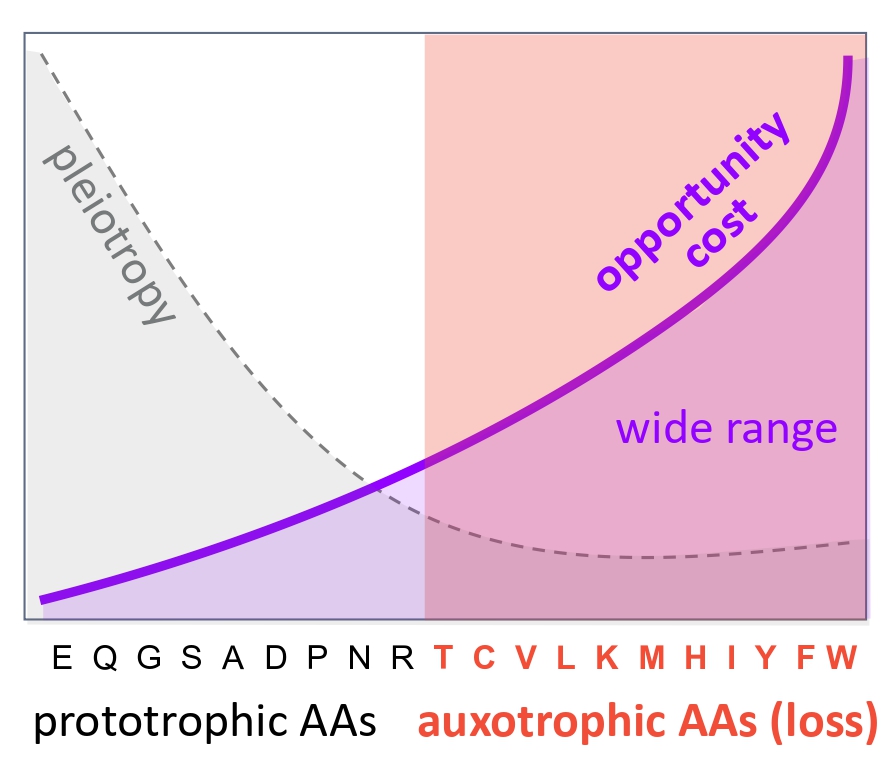 In animals, this appears to have enabled increased use of energetically costly amino acids in proteins. In our related work on bacteria, we observed a similar phenomenon: amino-acid auxotrophies can function as “costly outsourced traits,” allowing organisms to explore protein sequence space more freely and potentially evolve new functionalities.