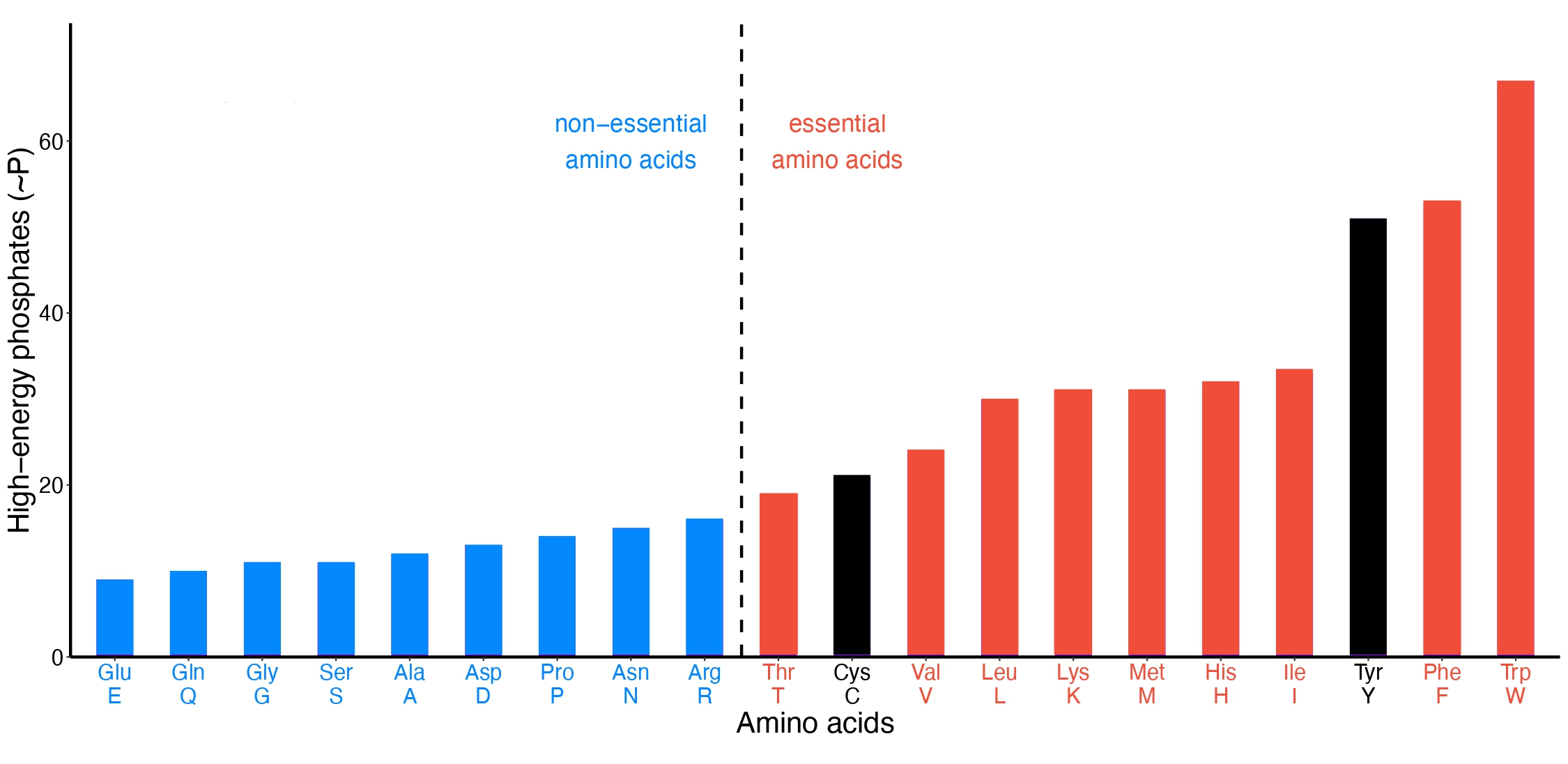 This observation suggested a simple but powerful idea: animals may have selectively lost the ability to synthesize the most energetically costly amino acids because it was advantageous to obtain them from the environment instead.