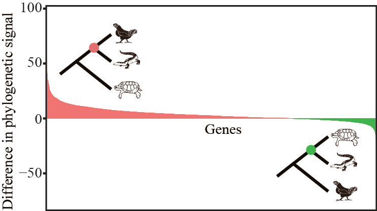 In this image, we’ve ranked the genes from those most highly in favor of crocodiles + birds (shown in red) to those most highly in favor of crocodiles + turtles (in green). Note that the area under the red curve is much larger than the green one, arguing strongly in favor of crocodiles + birds. Interestingly, a recent study using Bayesian inference to evaluate the relative support for the two alternatives came up with the same answer 10.