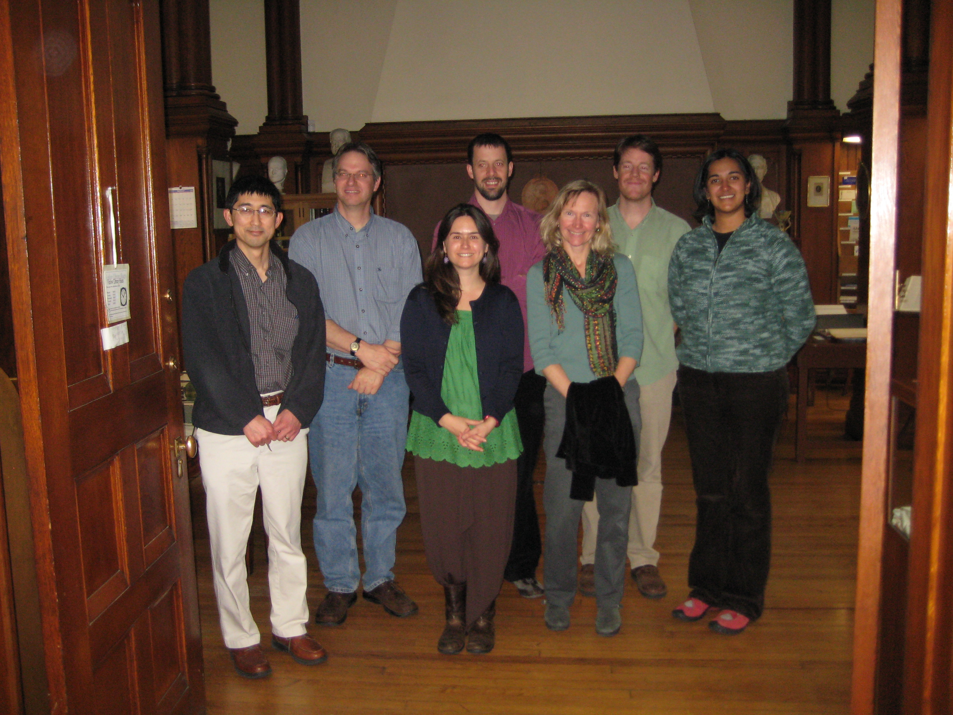 Radcliffe Institute working group, March 2008, at the Harvard University Natural History Museum. Left to right: Roger Koide, Jim Bever, Anne Pringle, James Umbanhowar, Nancy Johnson, Jason Hoeksema, Bala Chaudhary.