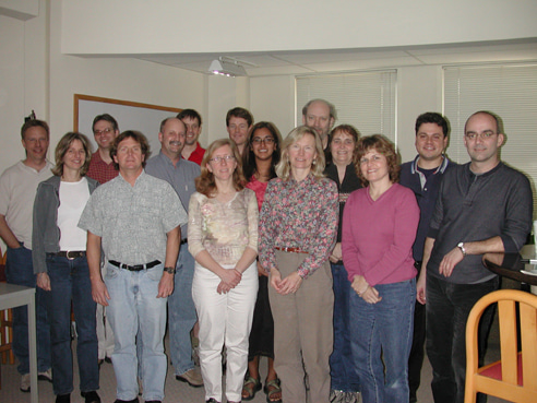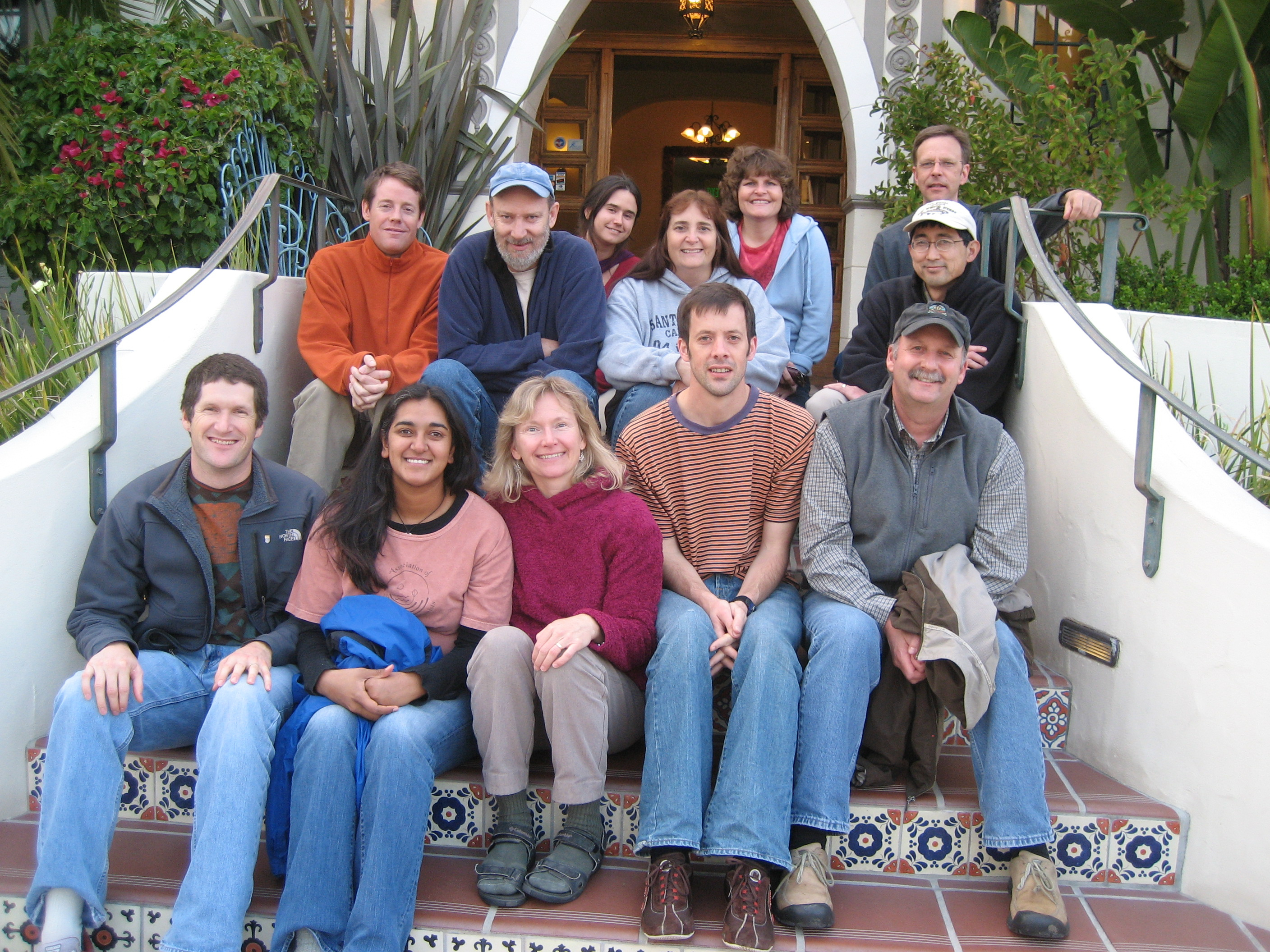 First mycorrhizal synthesis working group at NCEAS, January 2005. Front, left to right: Mark Schwartz, Cathy Zabinski, Nancy Johnson, John Klironomos. 2nd row, left to right: Suzanne Simard, John Moore, Bala Chaudhary, Gail Wilson, Peter Moutoglis. Back row, left to right: Bill Swenson, Jim Bever, James Umbanhowar, Jason Hoeksema, Mike Miller.