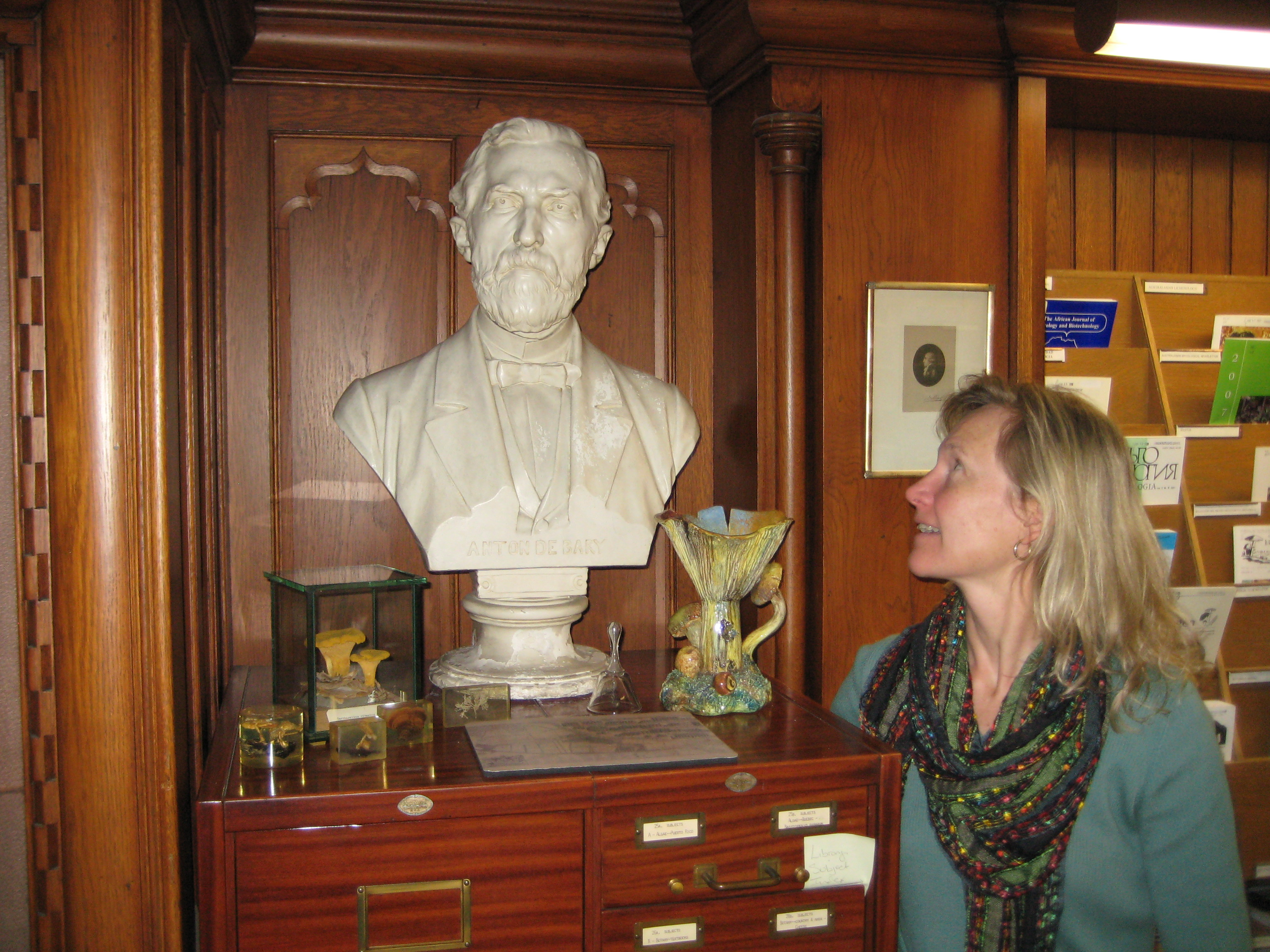 Nancy Johnson paying homage to Anton de Bary, who coined the term "symbiosis," at the Harvard University Natural History Museum, March 2008.