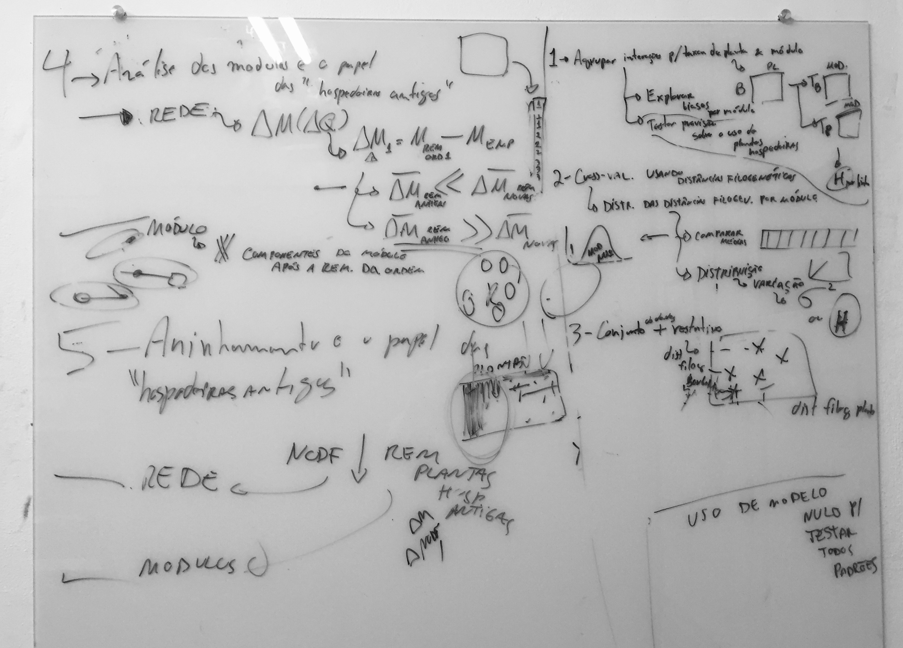 The co-author I have not mentioned yet is Paulo Guimarães, aka the network guy. I took a course with him a few years ago in Brazil and since then I’ve been hooked on network analysis. It’s a really interesting way to depict and extract information from a complex system. I had a hunch that the two hypotheses I introduced above should produce different network structural patterns. So I visited Paulo and in one very productive afternoon we came up with the analyses we could do to test the main predictions from each scenario (the white board picture shows the result of that afternoon). Later on we added the simulations to validate our verbal arguments.