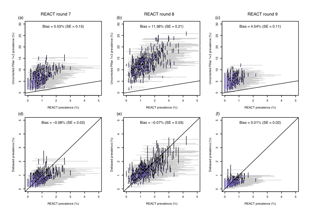 Figure 2 shows our statistical framework in action. The top row of panels shows the uncorrected test positivity rate against REACT prevalence estimates for the 311 local authorities in England, illustrating how test positivity was upwardly biased. The bottom row of panels shows how our prevalence estimates are unbiased relative to the REACT estimates.