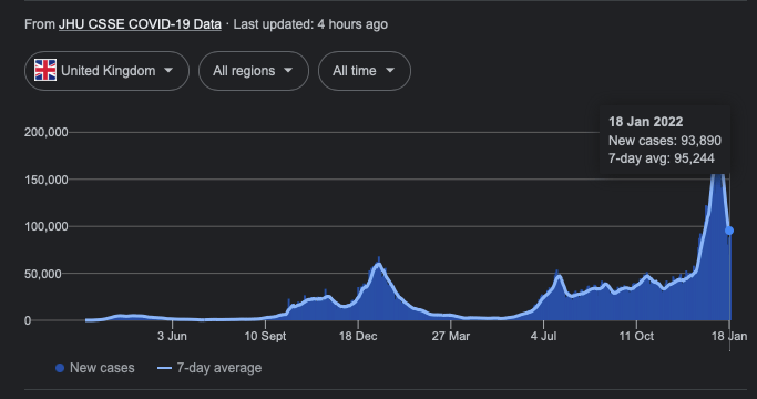 Figure 1. Number of new positive COVID-19 tests in the UK, from 2nd March 2020 to 5th January 2022, as illustrated following a Google search of ‘COVID UK’.