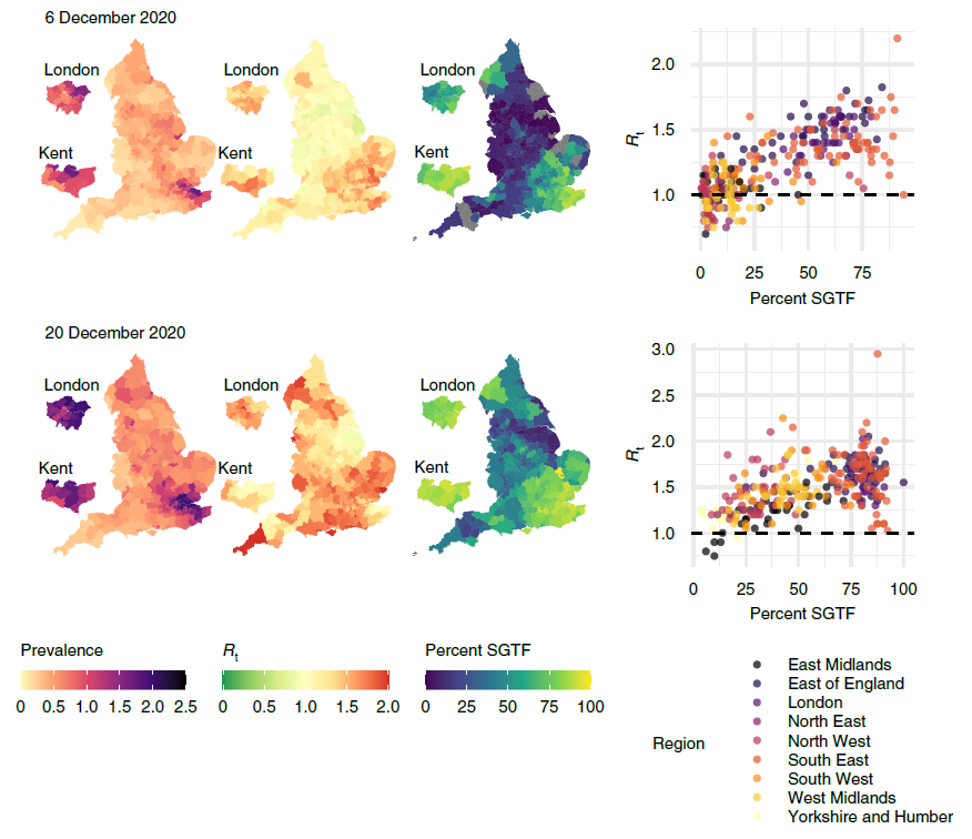 We can also use our framework to estimate the effective reproduction number Rt in different local authorities. We do this by fitting an epidemic model to the debiased data, which allows us to track the state of individuals from ‘susceptible’ to ‘infected’ to ‘recovered’ (known as an SIR model). We found that local estimates of Rt were indicative of one- to two-week-ahead changes in the number of positive tests, and that increases in estimated local prevalence and Rt reflected the spread of both the Alpha and Delta variants of the virus. Figure 3 uses our data to show the spread of the Alpha variant in December 2020.