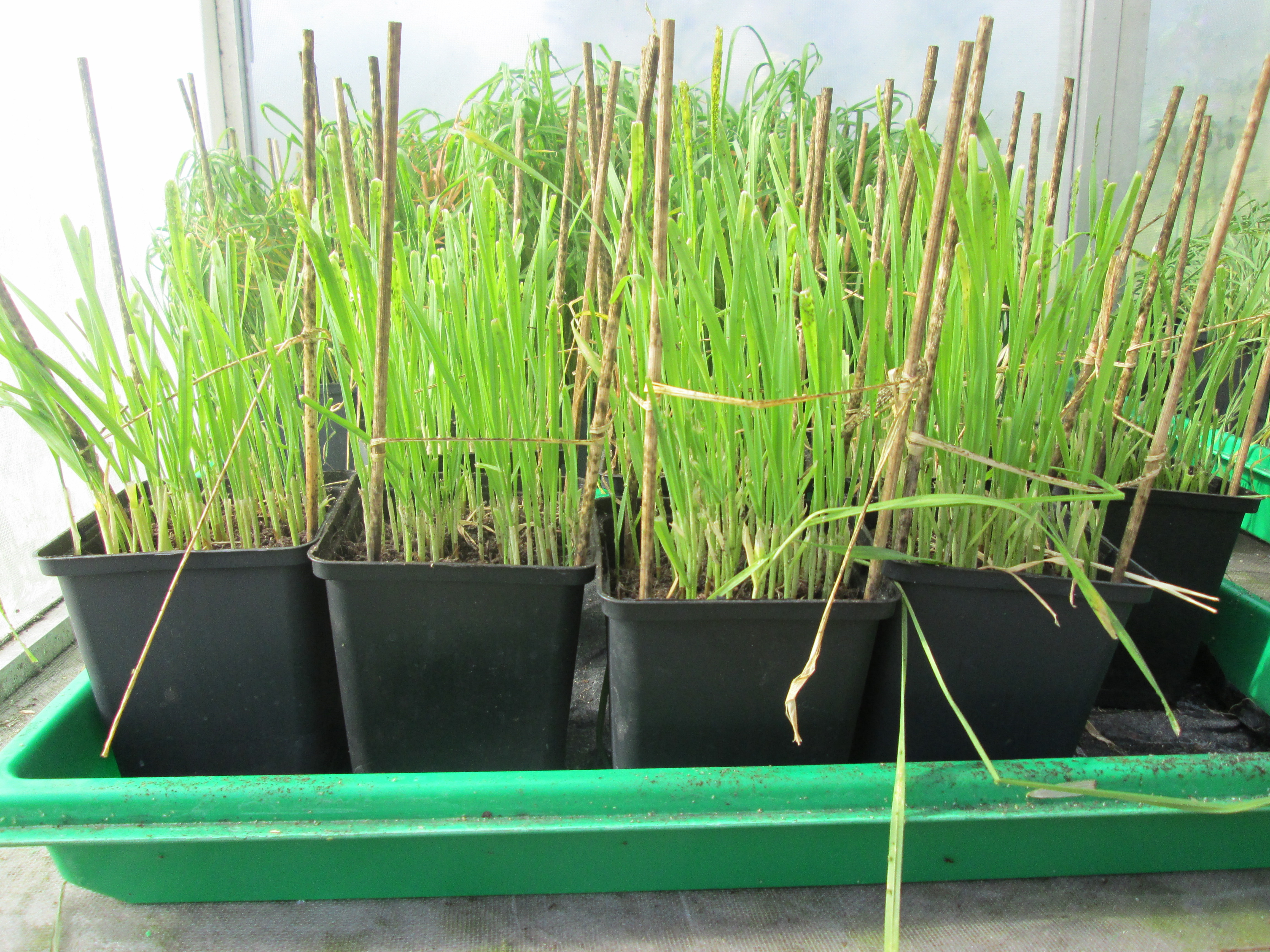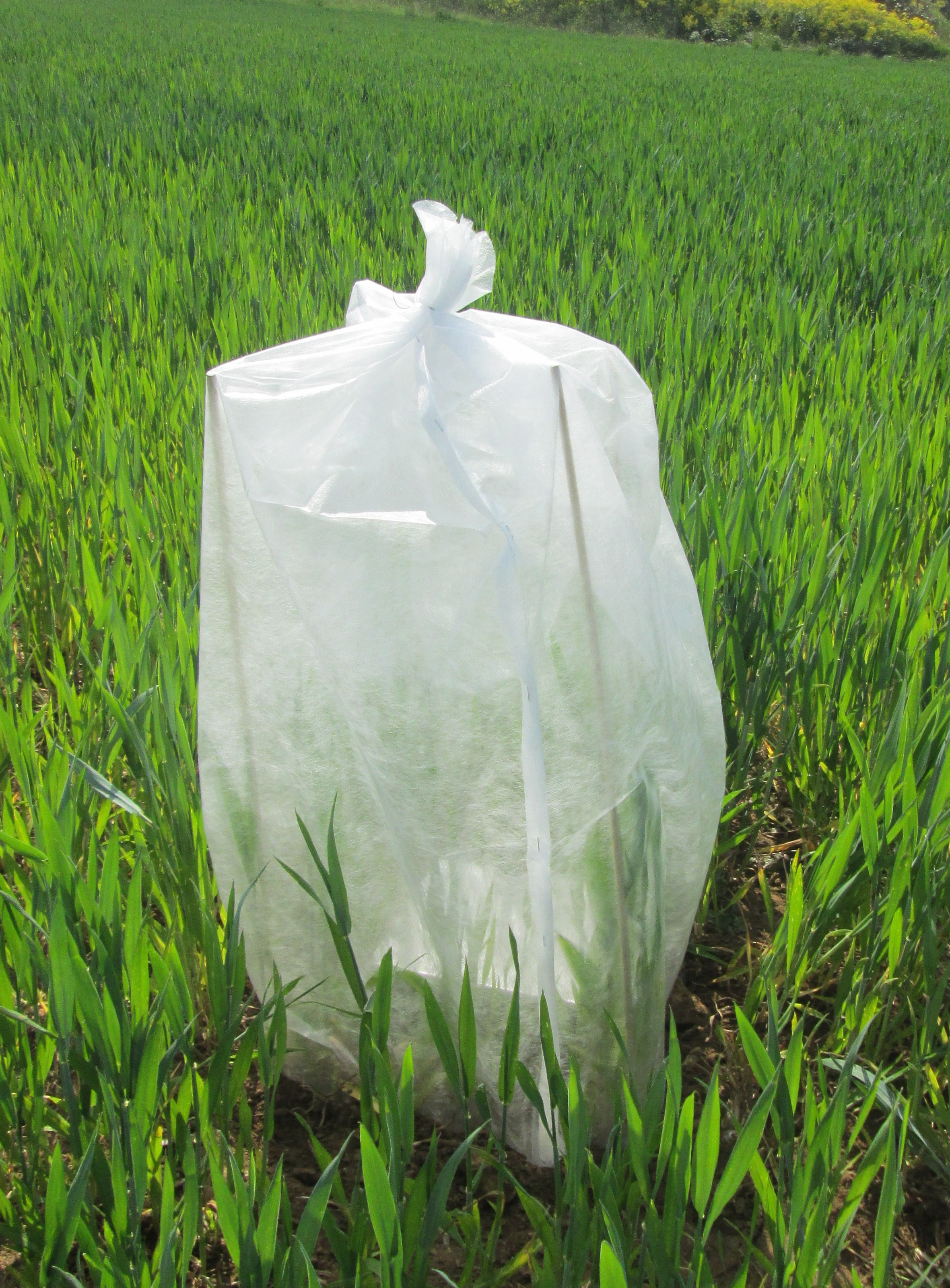 To standardize the natural enemy exclusion experiment as much as possible, a lab-reared Sitobion avenae clone was used, acclimatized to local conditions in outdoor cages (left) and reared on winter wheat (middle). On-field winter wheat patches used for the exclusion experiment were covered with permeable fleece prior to aphid inoculation and all natural enemies removed. Natural enemies were then able to resettle after successful establishment of aphid populations once final exclusion cages were set up. Photos © Sarah Redlich