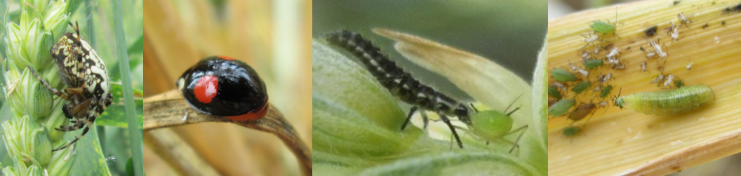 Natural enemies observed in our winter wheat fields (from left to right): web-building spiders, ladybirds, lacewing and syrphid larvae and their prey, the cereal grain aphid Sitobion avenae. Photos © Sarah Redlich