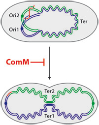 Finally, in view of the parallel between competence and stress response, we tested the possibility that the cell division delay preserves genome integrity by allowing cells enough time to complete transformation (Fig. 2). While it is generally assumed that the role of cell division inhibitors induced during the SOS response is to delay cytokinesis until after the genome has been repaired and fully replicated, this has never been proven. Here, we had a chance to test this using transformation assays. We knew that the transformation frequencies for a donor DNA carrying a single point mutation conferring resistance to an antibiotic were similar for strains containing or lacking ComM. We tried instead different donor DNA that could induce the formation of chromosomal rearrangements such as insertions and deletion of several kilobases, as well as inversions and large duplications that necessitate the formation of chromosome dimers as intermediates. Our reasoning was that these structures may require lengthy periods of time for their integration. With these new donor DNAs, we did observe 2 to 3-fold reductions in transformant frequencies of comM mutants. As Jean-Pierre used to say: “whatever the amount, if we halve our a salaries, we will certainly find this reduction as significant!”. Nonetheless, to reveal and emphasize the role of ComM during transformation, we eventually combined the comM mutation with mutations of genes involved in the resolution of chromosome dimers. Our results confirmed the importance of the cell division delay in maintaining genome integrity when the chromosome is engaged in recombination events during transformation.