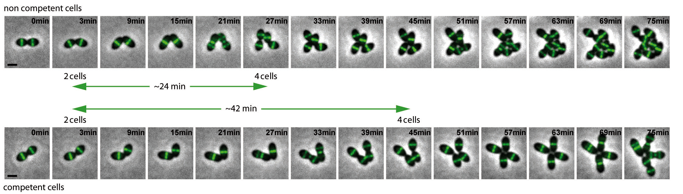 We quickly tested Jean-Pierre’s idea and demonstrated that he was right. Using time-lapse microscopy, we found that cell division was delayed in competent cells (Fig. 1). The measurement of morphological parameters of individual cells indicated that both the initiation of cell division and the final constriction of the cytokinetic ring were delayed. We finally identified ComM, a membrane protein induced during competence, as the factor that is necessary and sufficient for these alterations. ComM was previously described as the immunity protein involved in fratricide, the killing mechanism that can be used by competent cells to acquire DNA from non-competent pneumococci.