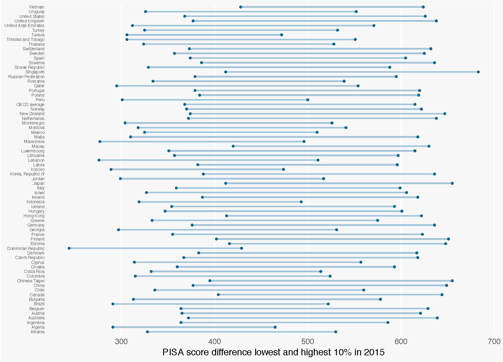 Figure (1) shows the difference between the top and bottom 10 per cent of performers in PISA across OECD countries in 2015.