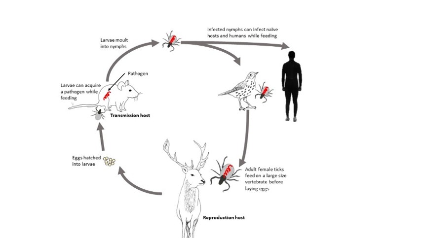 Lyme disease pathogens, transmitted through bites of infected ticks, are a growing threat, with disease incidence rising across the northern hemisphere. Ixodid ticks (hard-bodied ticks) have complex life cycles; After hatching, larvae take a blood meal from a host, attaching for a few days, before dropping into the leaf litter to digest their meal. They moult into nymphs, which will take another blood meal from a different host before dropping and moulting into adult ticks. Adult females will take one last blood meal before laying thousands of eggs, bringing a new generation.