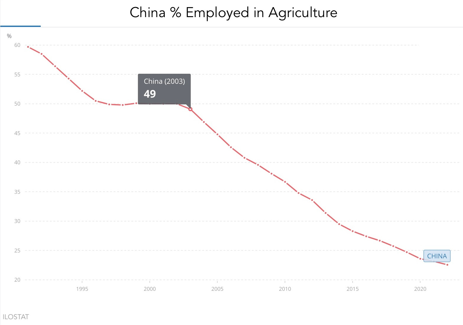 That's odd because people in China are leaving farming. In 2003, China dipped below 50% employment in agriculture for the first time in modern history.