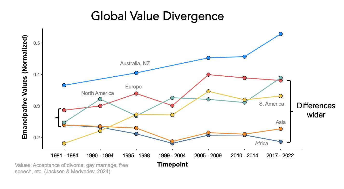 For example, consider the World Values Survey. Researchers tallied up all the questions about values in survey going back to the 1980s to calculate how different values are around the world. From the 1980s to 2020, cultures became more different, not more similar.