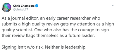 McDowell, Knutsen, Graham, Oelker, & Lijkek (2019) found that many PhD students do not find their names on peer review reports submitted to journal editorial staff even though they had co-written the report with a more senior researcher. In such instances of “ghostwriting” the PhD student usually does most of the work while the senior researchers is the only one that profits by gaining appreciation from the editor. An open review system would provide public credit to reviewing PhD students (for example by making reviews citable, Hendricks & Lin, 2017) but would also provide less tangible rewards like senior researchers acknowledging their skills as a high quality scientist (see Tweet 1 below).