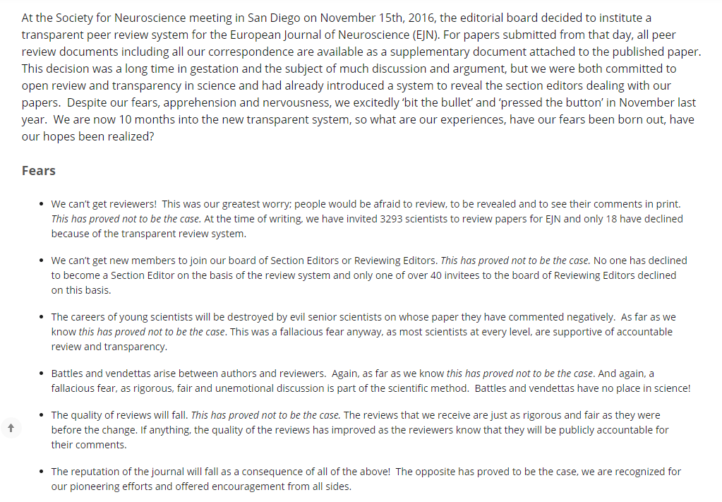 Excerpt from the summary report of the European Journal of Neuroscience about their new open peer review system. Retrieved from https://www.wiley.com/network/researchers/being-a-peer-reviewer/transparent-review-at-the-european-journal-of-neuroscience-experiences-one-year-on