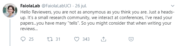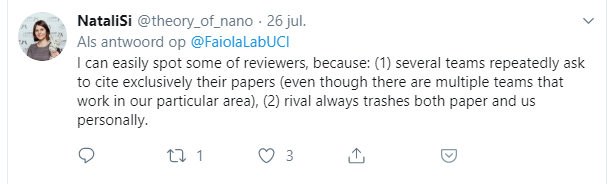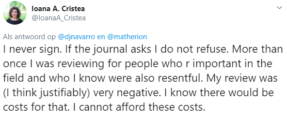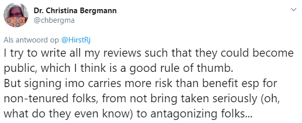 1) The main argument put forward against open peer review is that PhD students who write negative reviews may frustrate other researchers who could then retaliate. For example, vindictive researchers could provide negative reviews of the PhD student’s future work or could speak badly about them to their colleagues during a conference or in personal e-mails. This is plausible, but it is unsure whether a blind review system would prevent such practices as anonymity is by no means guaranteed. Many authors at least think they are able to correctly identify their reviewers (see Tweet 2 and 3), and a review found that masking reviewers’ identities was only successful about half of the time (Snodgrass, 2006). In any case, open peer review at least makes situations of power abuse easier to identify.