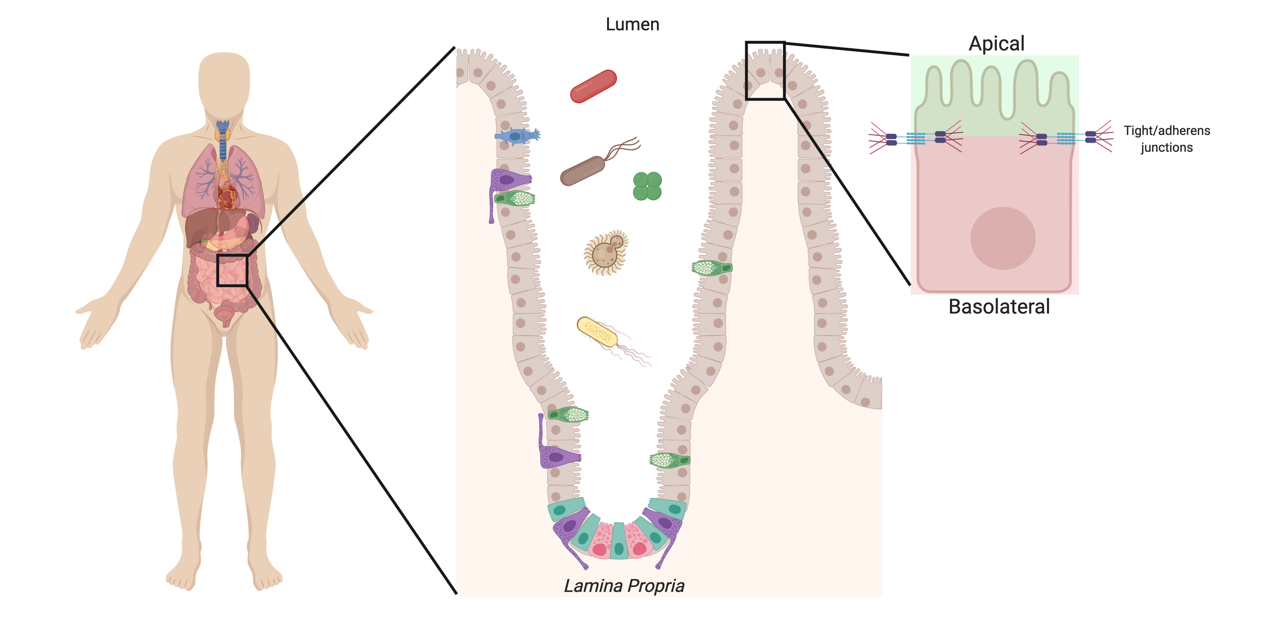 Within our body, our intestinal cells provide a valuable layer, which is responsible for the nutrient uptake needed to fuel our bodies. However, what many people do not appreciate is the important role that our intestinal cells play in protecting our body from foreign pathogens. Unlike immune cells which are programed to fight and respond to the presence of foreign invaders, our intestinal cells are in constant contact with the commensal microbiota and therefore must have a fine balance between tolerating and responding to incoming pathogens (Figure 1). One way that intestinal cells accomplish this is through cellular polarization (creating functional differences between the top side and the bottom side of the cells) and the formation of a tight barrier. Intestinal cell polarization arises from a complex signaling pathway which creates an apical membrane facing the microbial containing lumen of the gut and the basolateral membrane facing the tissue side (lamina propria) (Figure 1). The barrier is formed by tight protein interactions between neighboring cells called tight and adherens junctions (Figure 1).