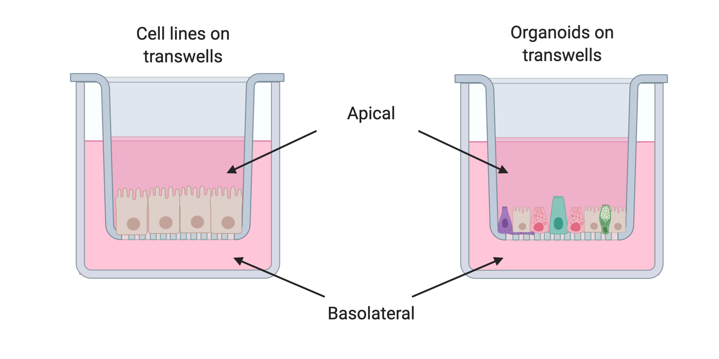 Figure 2: Transwell inserts of colon carcinoma cells or human intestinal organoids allow us to access both their apical and basolateral sides for infections/stimulations