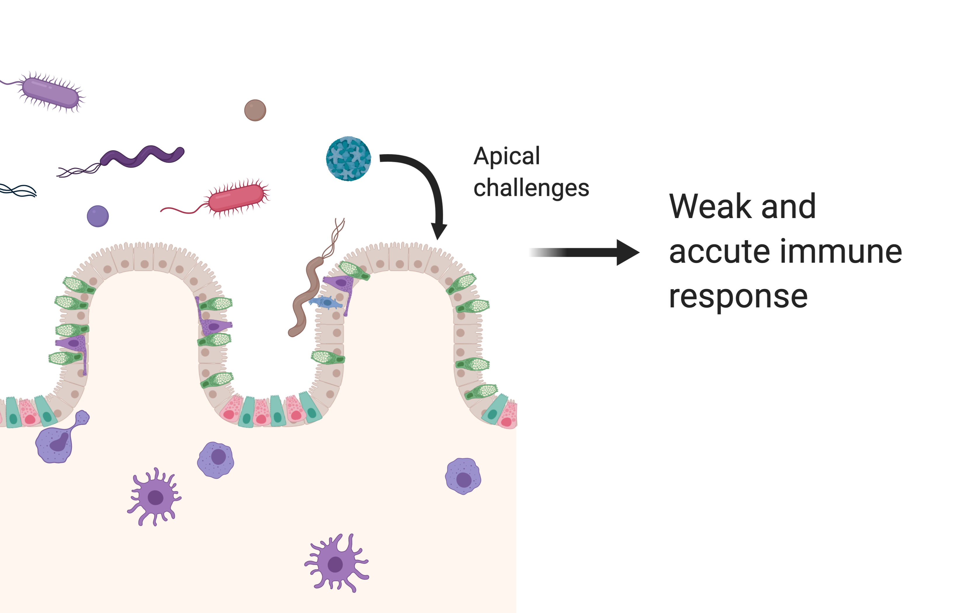 Figure 3: Within a healthy gut the commensals and pathogens are normally exposed to the apical side. Intestinal cells then respond to apical stimulation/infection in an acute manner to limit tissue inflammation. However, when pathogens pass to the underlying basolateral side, intestinal cells respond in a strong and prolonged manner to protect the tissue.