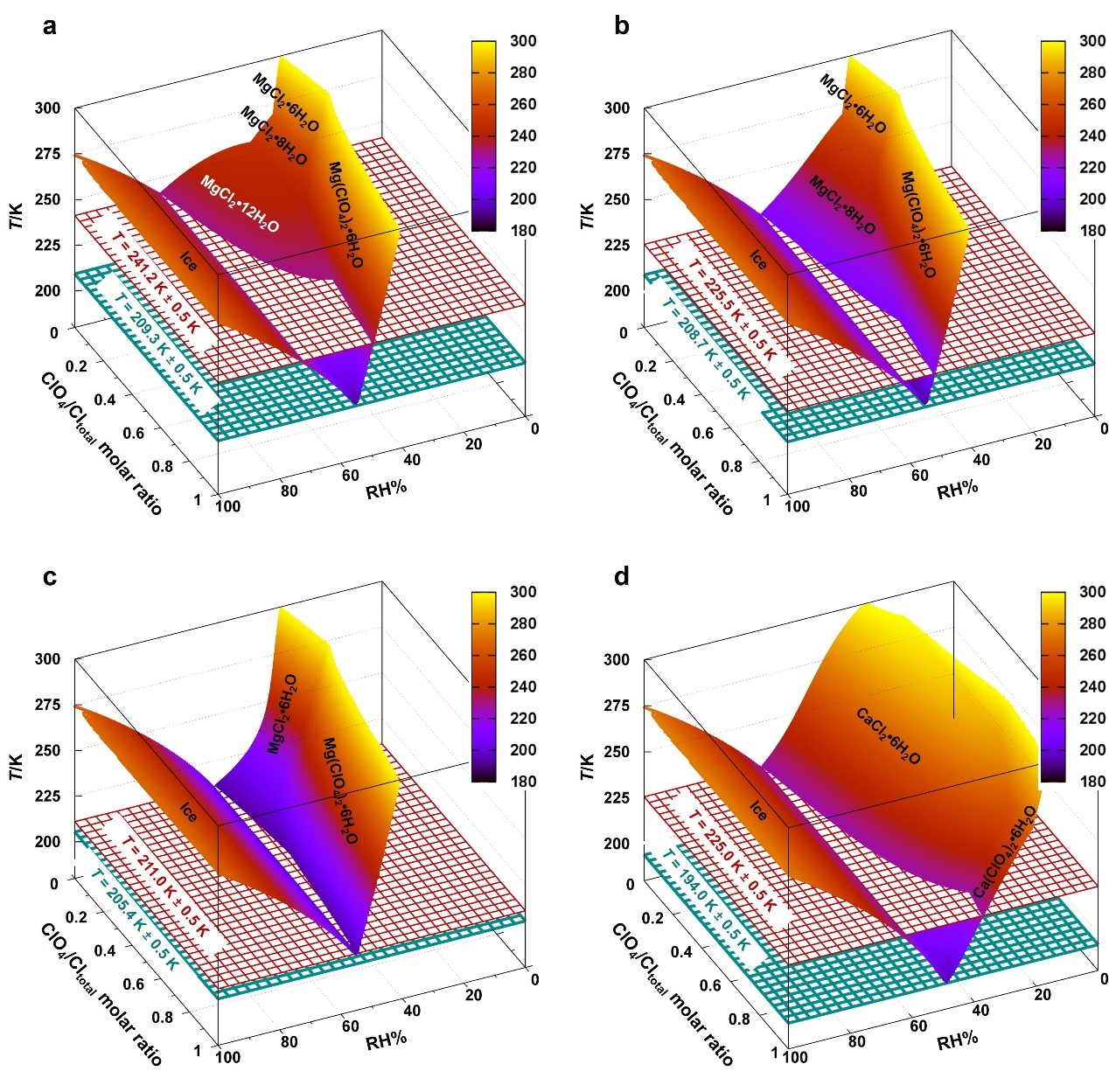 Fig. 1. Deliquescence surfaces of mixed hydrated Mg- and Ca- perchlorate/chloride salt mixtures calculated using the thermodynamic model.