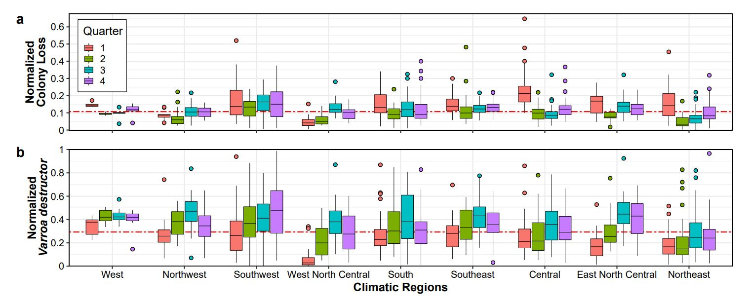 Ultimately, our study highlighted the spatio-temporal complexities of honey bee colony loss, and its association to different stressors, across the whole United States. Our results may also serve to focus future efforts by beekeepers, agricultural producers and scientists – as they suggest that varroa mite management, a reduction in pesticide exposure, and preparation for extreme weather events may mitigate honey bee colony loss.